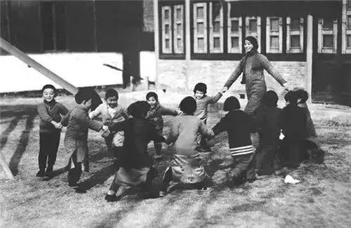 1918年,南京,金陵女子大学校门前玩耍的孩子。