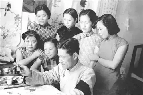 1936年,南京,中央大学美术教授张书旂的女弟子在观看他作画。