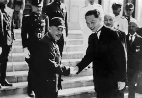 1942 年6月9日,南京,汪精卫在伪国府礼堂迎接张景惠等人。