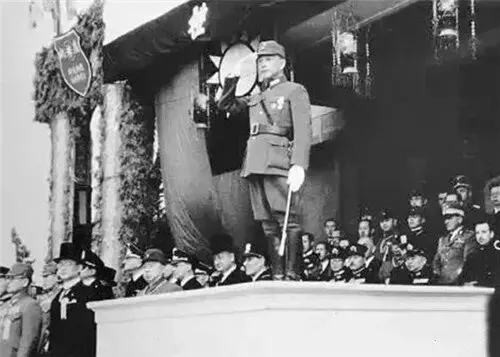 1943年3月30日,汪伪政府在南京举行"国府还都"三周年典礼 ,汪精卫在主席台上向游行队伍敬礼。
