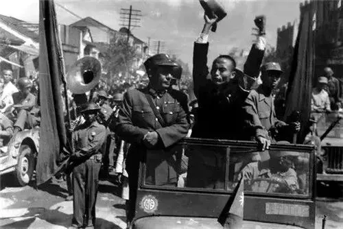 1945年9月11日,南京市,国军新六军凯旋还都,前导吉普车上的人员高举双臂庆祝抗战胜利。