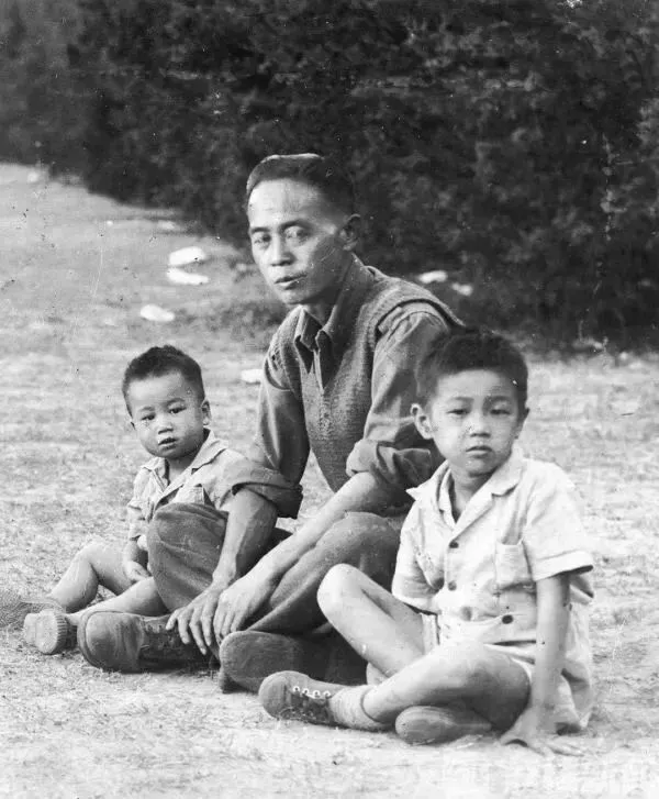 1946年10月,拉贝的助手陈斐章与两个儿子在中山陵草坪合影。