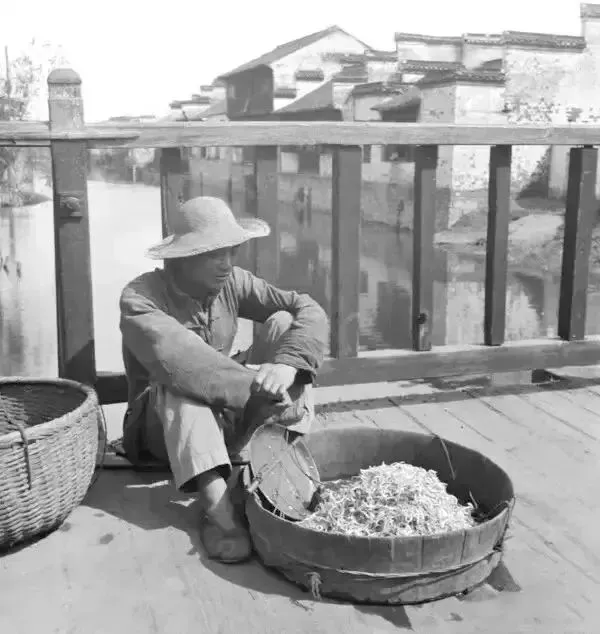 民国时期,南京城南,秦淮河某桥上卖豆芽的菜贩。