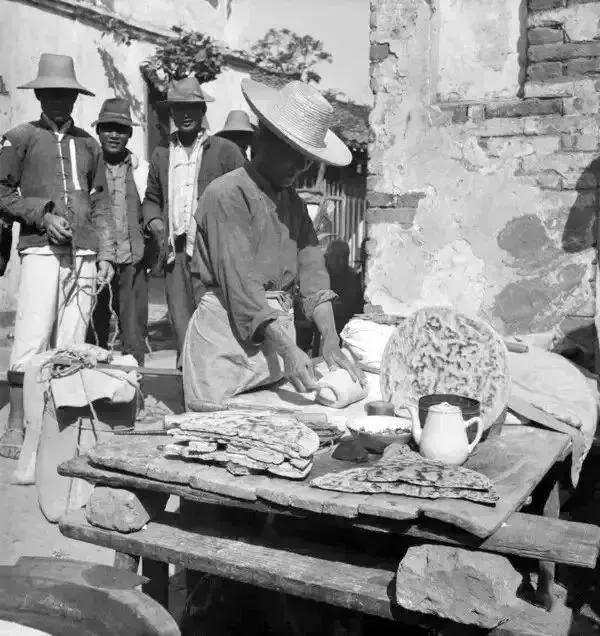 民国时期,南京,街上做葱油大饼的摊贩。