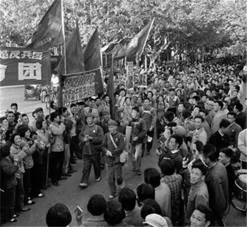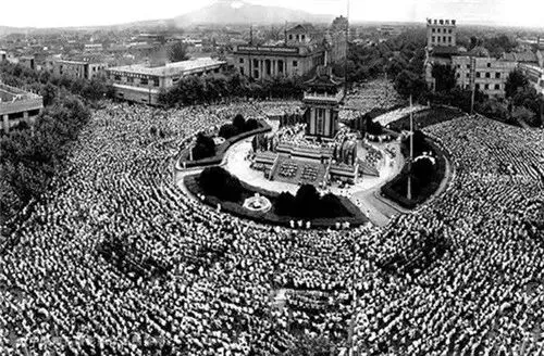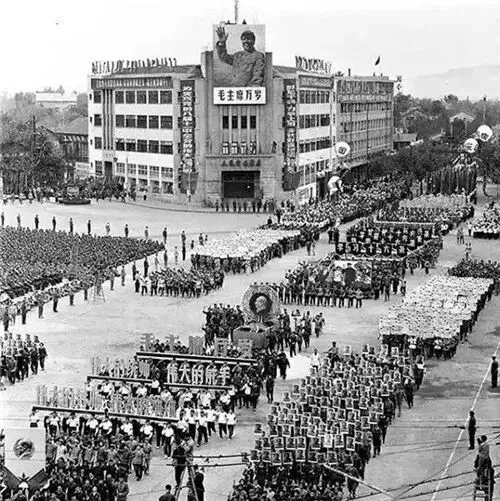 1966年10月1日,南京市40万人在鼓楼广场庆祝建国17周年,这是国庆节游行队伍。