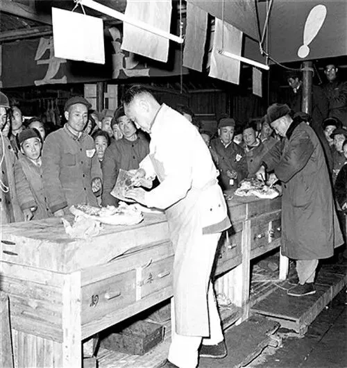 1965年,南京市民节日期间拿着猪肉票排队购买猪肉。