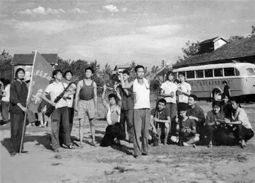 1971年8月,南京化纤厂长丝车间文艺宣传队在去南京近郊汤山"拉练"。