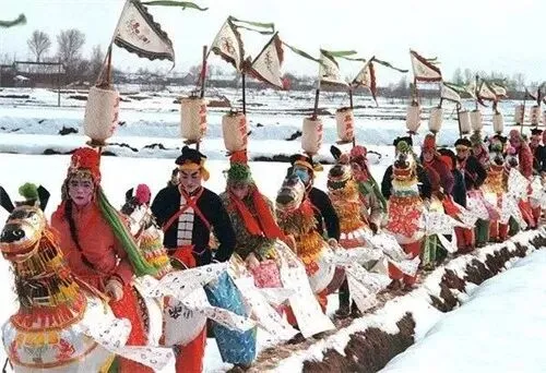 1982年,南京江宁县秣陵镇农民为欢度春节,踏雪去邻村巡回演出。