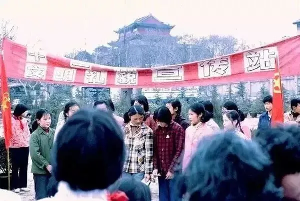 1980年代,鼓楼广场前,文明礼貌宣传站。