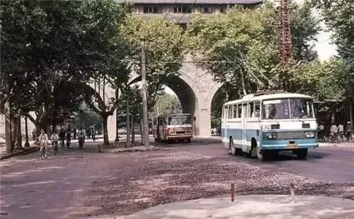 1983年,南京,穿过挹江门的32路公交车。