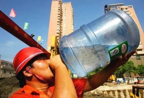 2006年8月3日,南京一建筑工地,由于天气炎热,一工人拿着桶装水桶直接饮水。