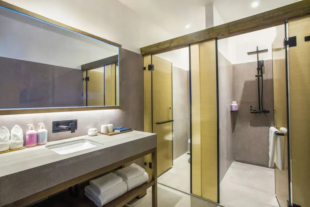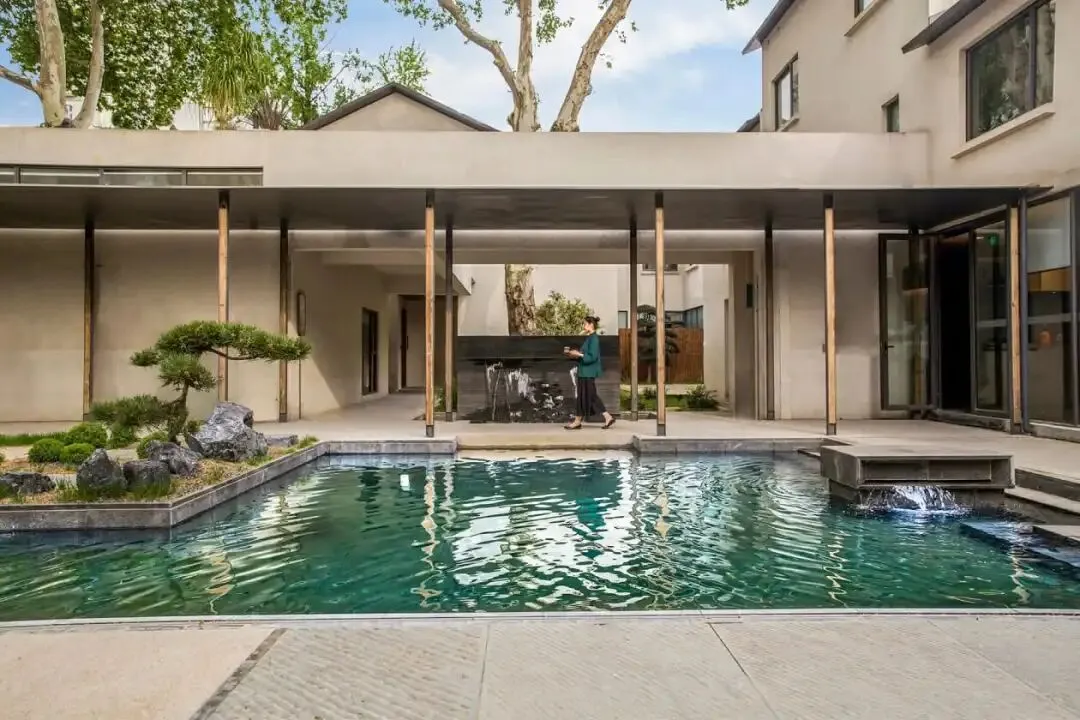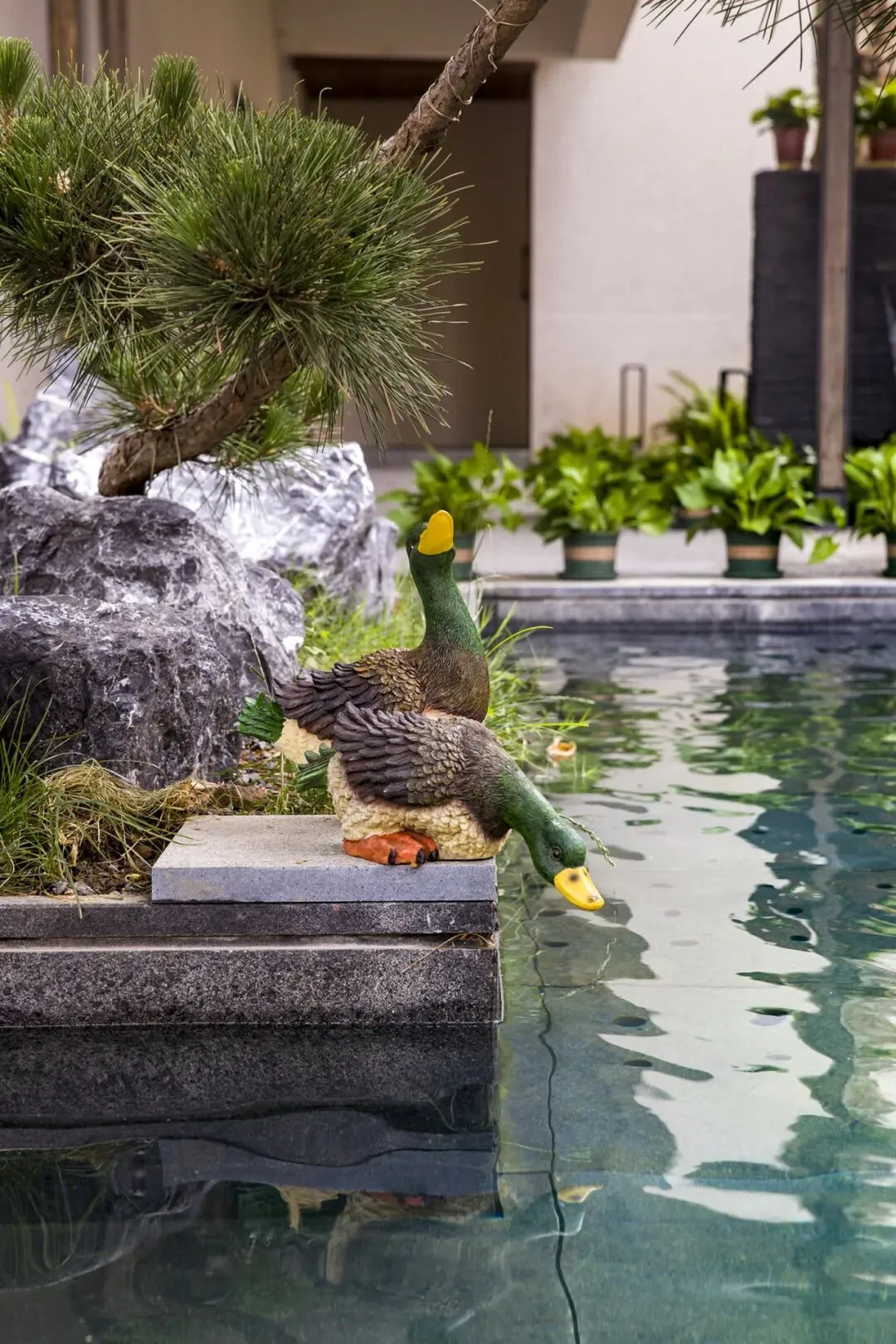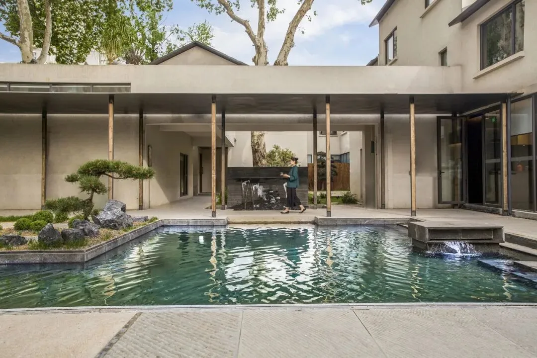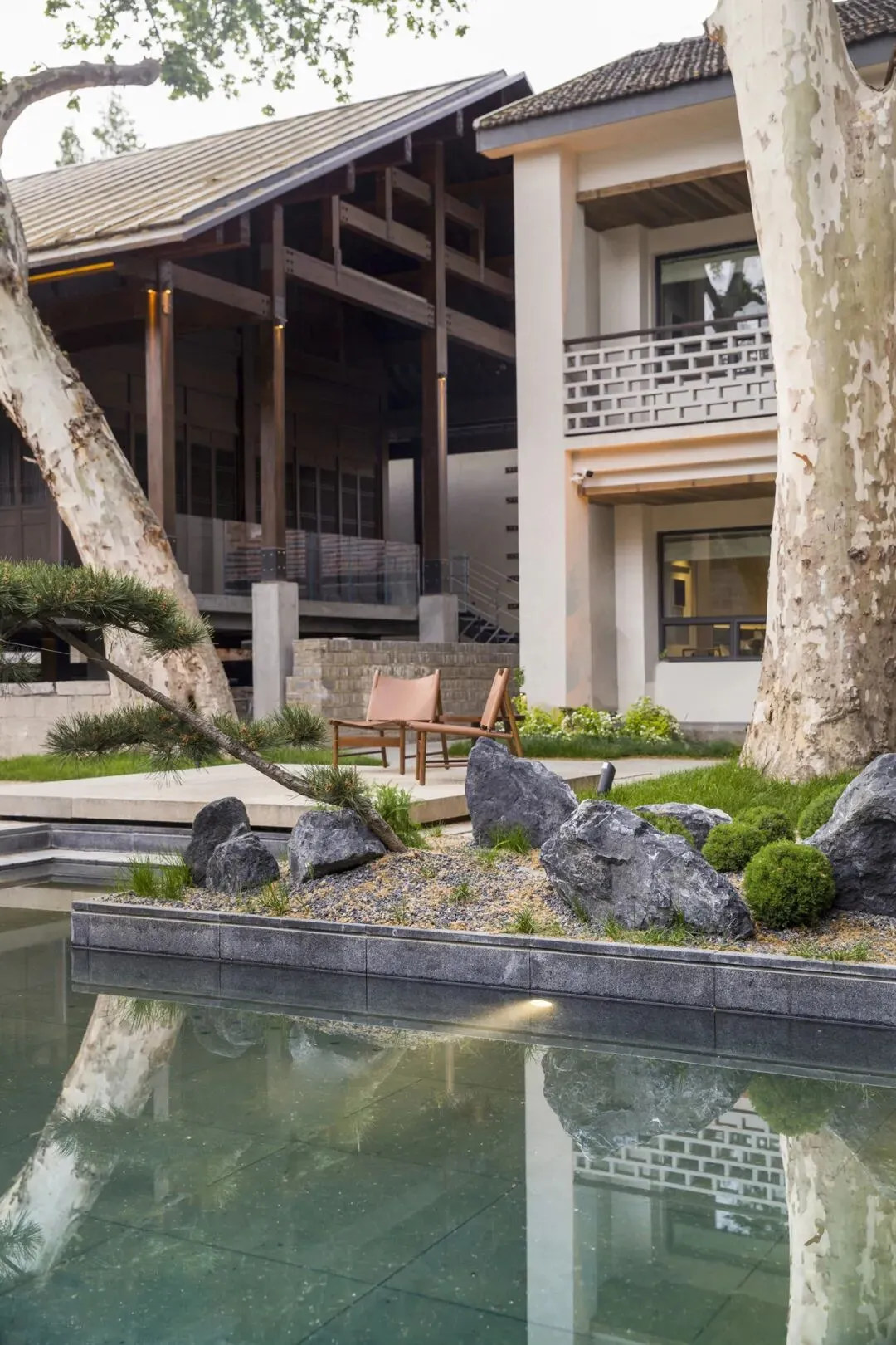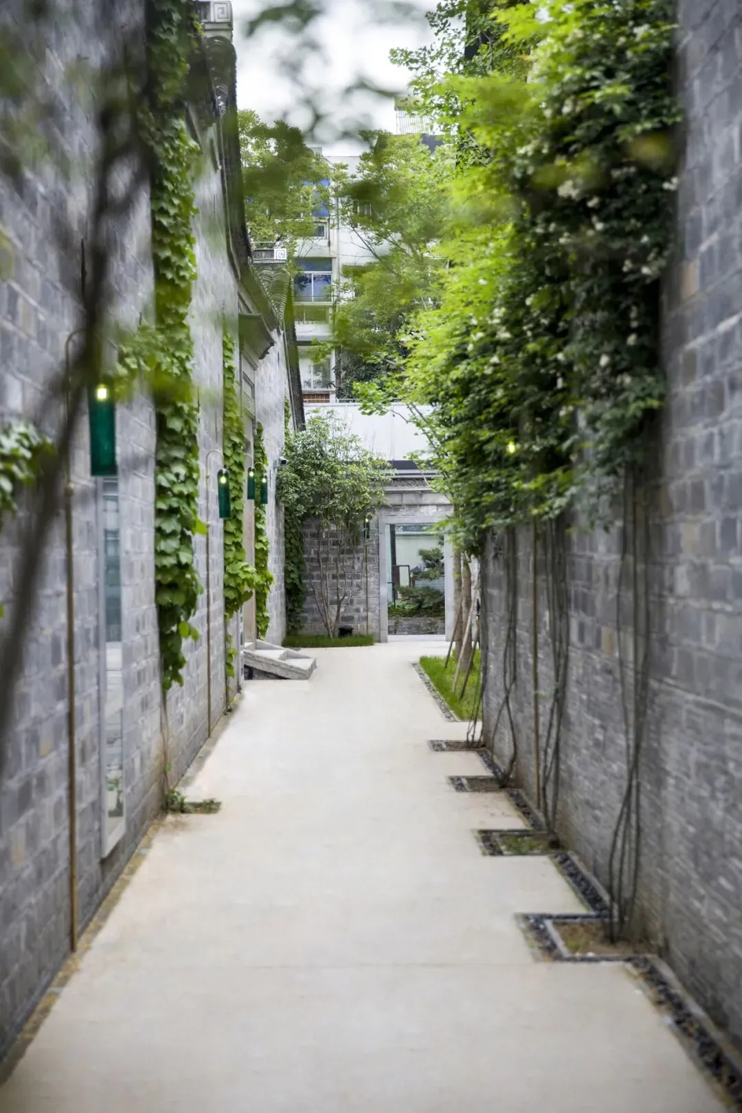 游走于酒店各处,石墙、灰瓦、木门、花窗...清潭幽水倒映着绿植青柏,地锦繁花顺着墙角爬上时光的脉络,让人觉得这并不是一家酒店,而是一个庭院幽幽的“游园惊梦”。