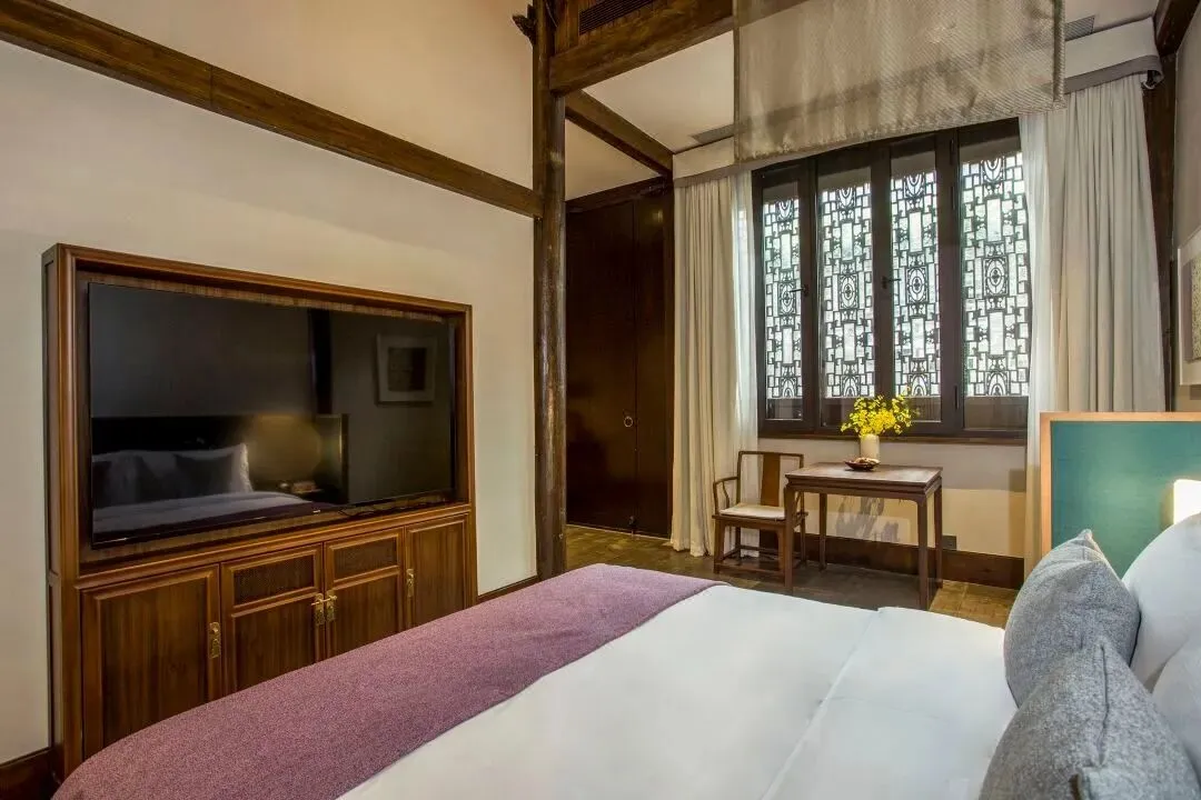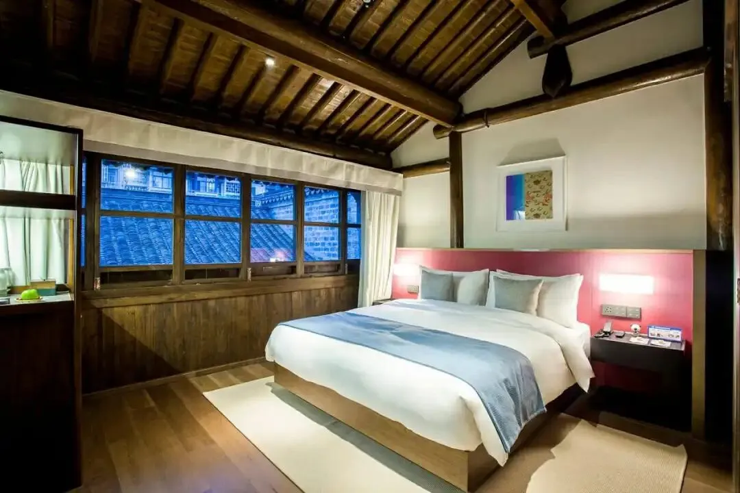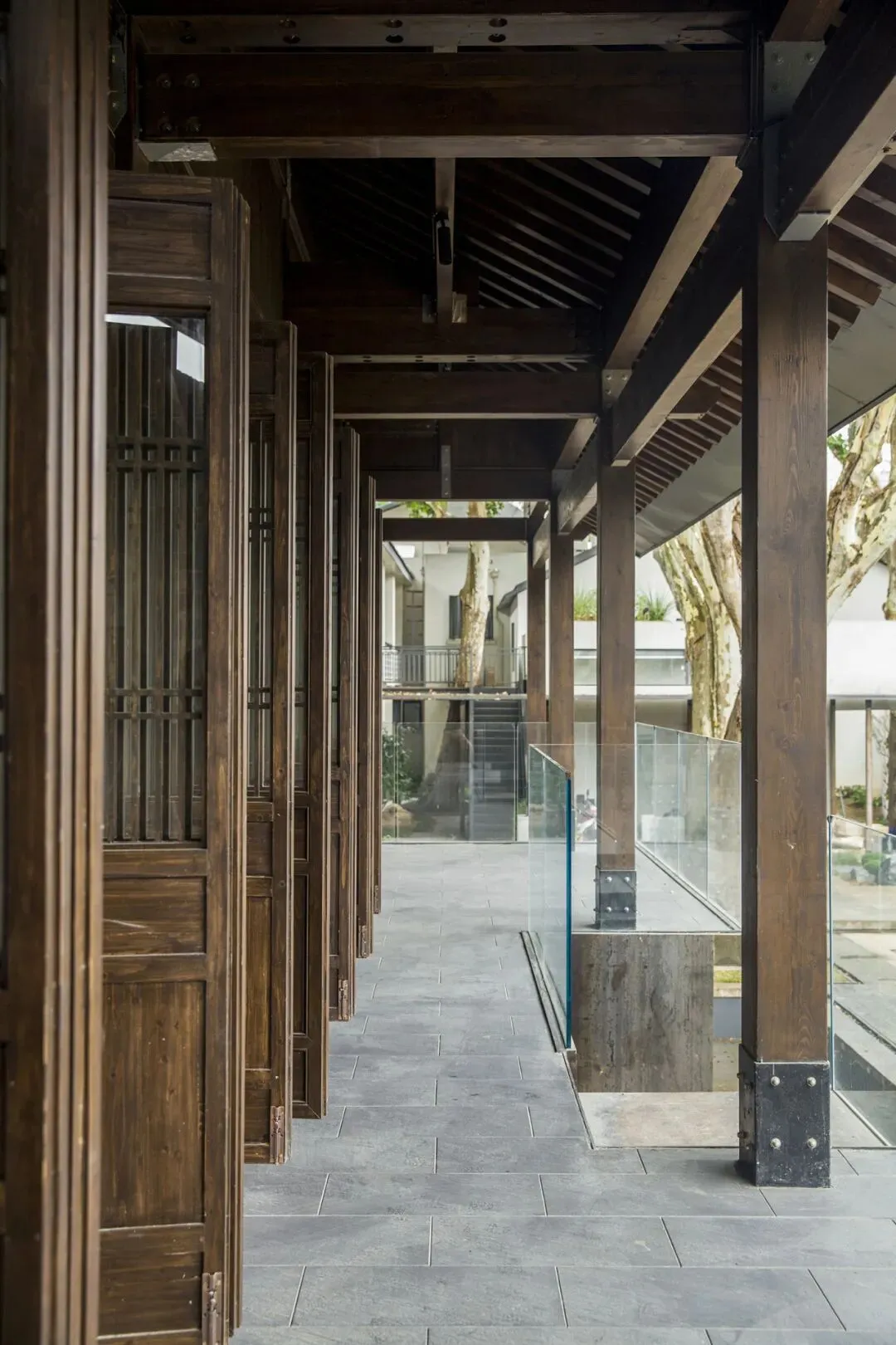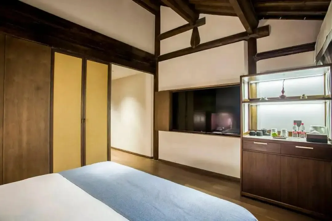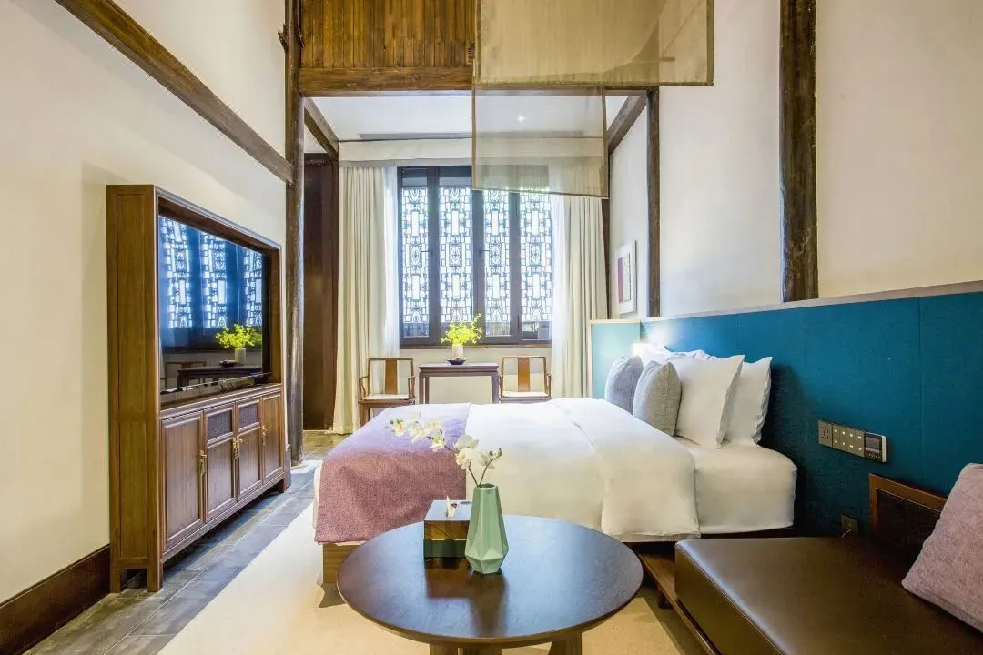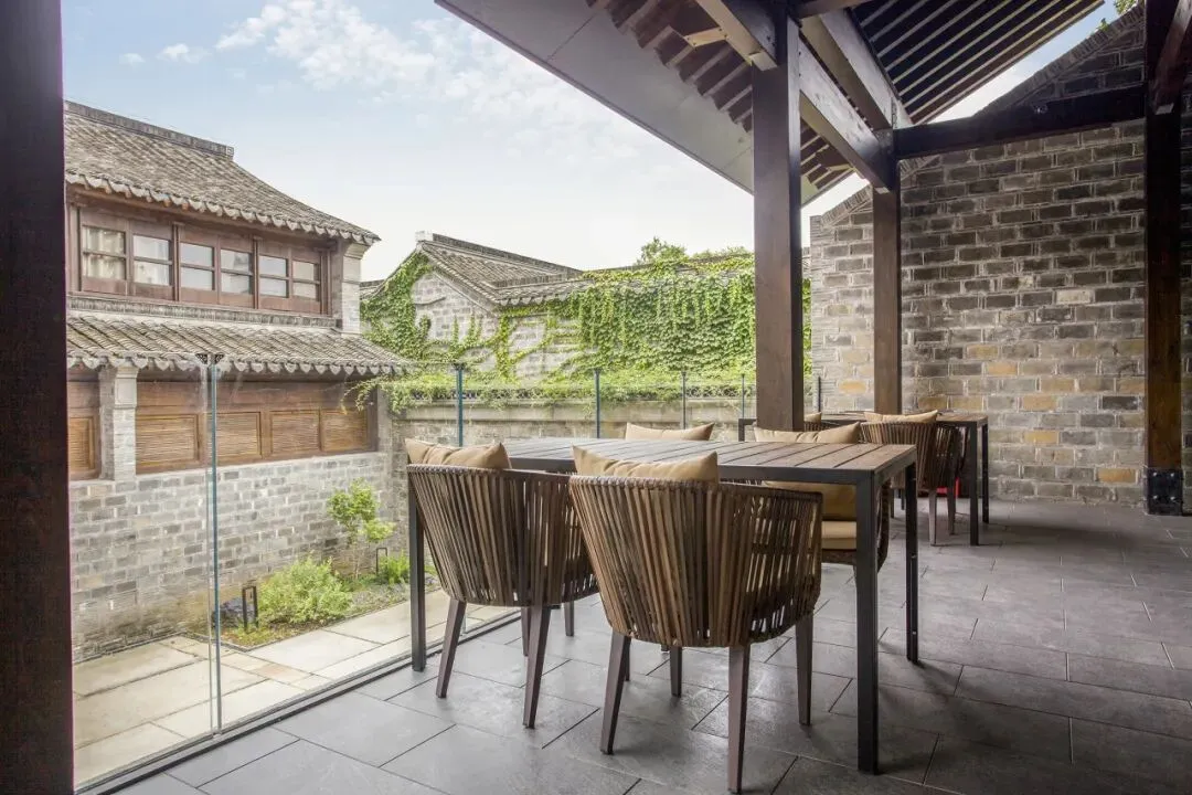走近酒店,你会发现青砖灰瓦的外观在一众古建中铺陈开来,浑然天成,仿佛走进了一场时光的回溯。