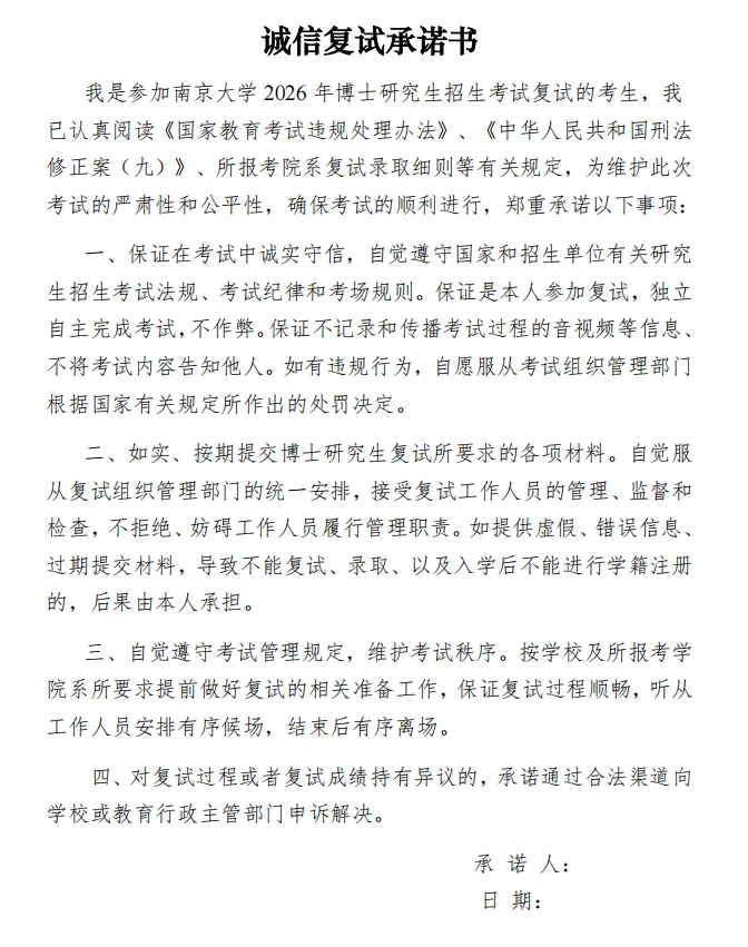 往届硕士毕业生: (1)有效居民身份证原件; (2)外语成绩证明原件; (3)本科毕业证书和学位证书原件; (4)硕士毕业证书和学位证书原件; (5)考生已手写签署的《诚信复试承诺书》(见附件1)。