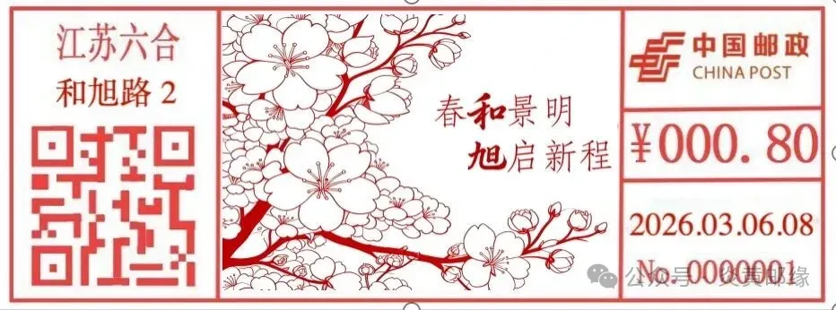 2026年3月3日,南京邮政六合区“平顶山邮局”将正式更名为“和旭路邮局”。此次更名不仅是邮政服务网点的一次重要升级。时值初春,更寓意新的开始与勃勃生机,也标志着该局将以新名称、新形象更好地服务社区、连接城乡。为记录这一历史性时刻,并借助邮政文化载体传播美好寓意,南京邮政六合分公司将启用《春和景明 旭启新程》邮资机宣传戳。