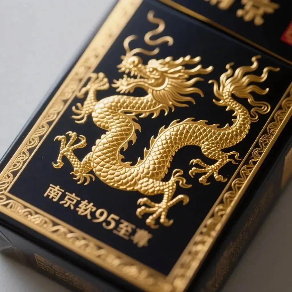 南京(软九五至尊)的包装设计堪称艺术品,以明黄 + 正红为主色调,尽显皇家气派。正面“双龙戏珠”浮雕图案采用8色烫金工艺,龙鳞在不同角度下呈现渐变光泽,仿佛两条真龙在盒面上栩栩如生。盒身顶部激光全息防伪标变换角度可见“南京”字样与辟邪兽图案交替出现,侧面城墙图案砖缝线条工整清晰,象征着南京这座历史名城的深厚底蕴。
