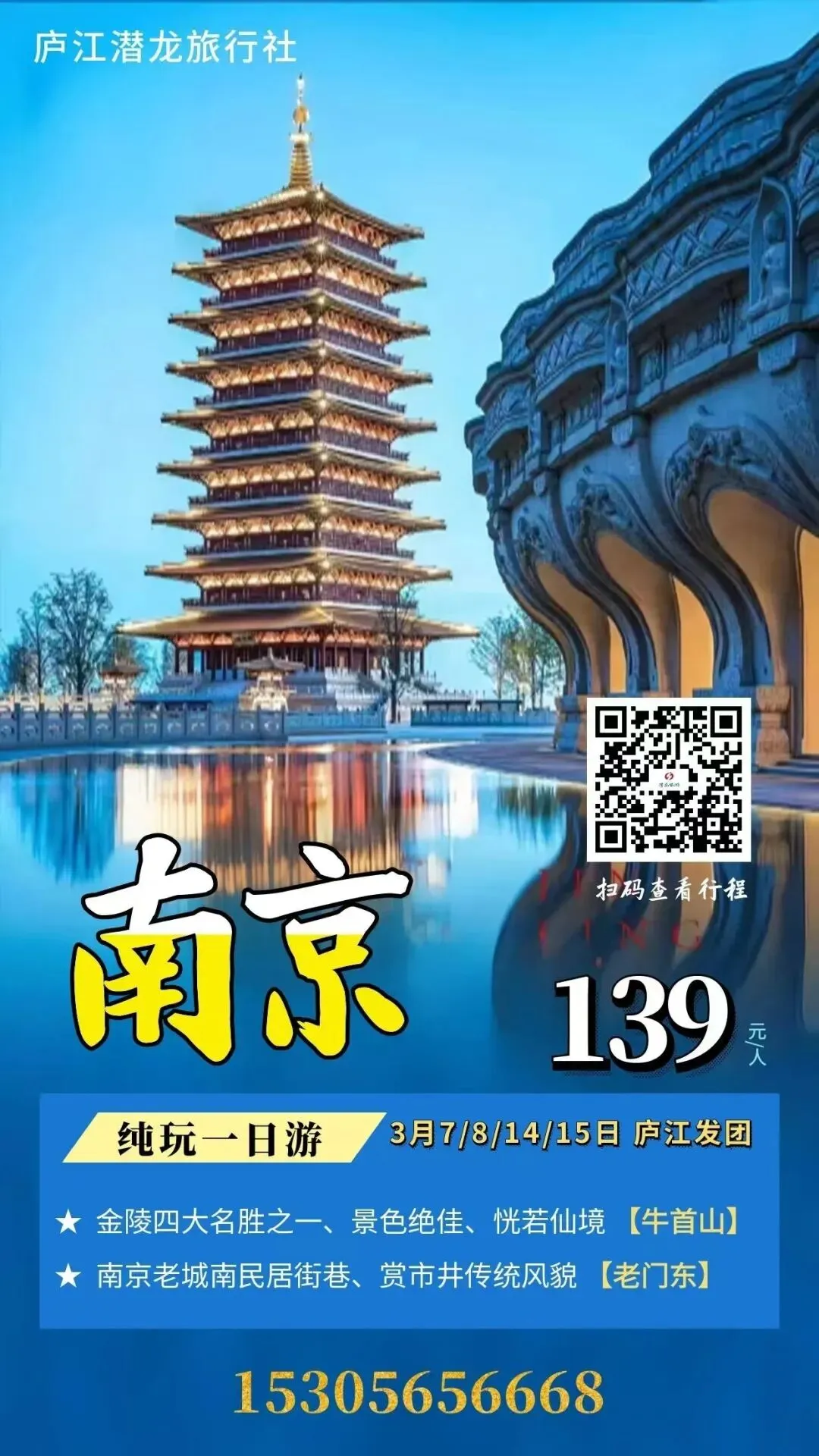 早7:00庐江县政府门口集合;7:20出发,乘车前往南京,赴【老门东历史街区】(自由活动1小时),老门东是南京老城南地区的古地名,位于南京夫子庙箍桶巷南侧一带。历史上的老城南是南京商业及居住最发达的地区,如今按照传统样式复建传统中式木质建筑、马头墙,集中展示传统文化,再现老城南原貌。日前,一座仿古牌坊在门东地区北界亮相,坊额上写着“老门东”三个字。这标志着集中体现南京老城南民居街巷、市井传统风貌的老门东,将重新进入游人眼中。今后,人们穿过“老门东”牌坊,即走进了老城南传统民居生活,一条条老街巷将让人重新感受老城南风貌。