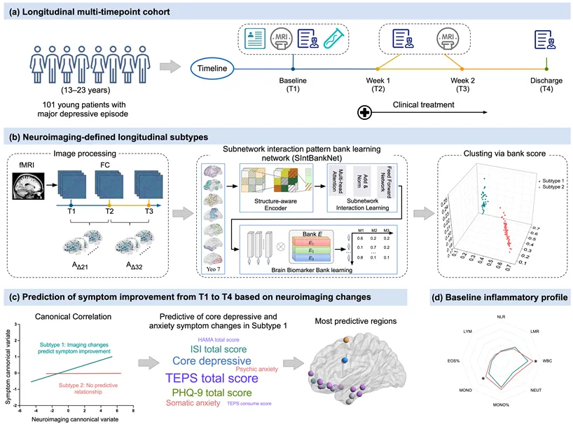 该论文基于101名青少年重性抑郁发作患者(13-23岁)的纵向多时间点队列,采用基于Transformer的深度学习框架,识别出两种在治疗过程中具有不同影像轨迹和临床特征的纵向亚型。两个亚型在影像变化与症状变化之间表现出不同的预测关系:亚型1在治疗过程中功能连接变化与症状改善存在显著相关性,而亚型2未发现此类关联。亚型1的症状改善预测主要涉及默认网络相关脑区。此外,基线时炎症特征分析显示,亚型2的炎症水平明显高于亚型1。