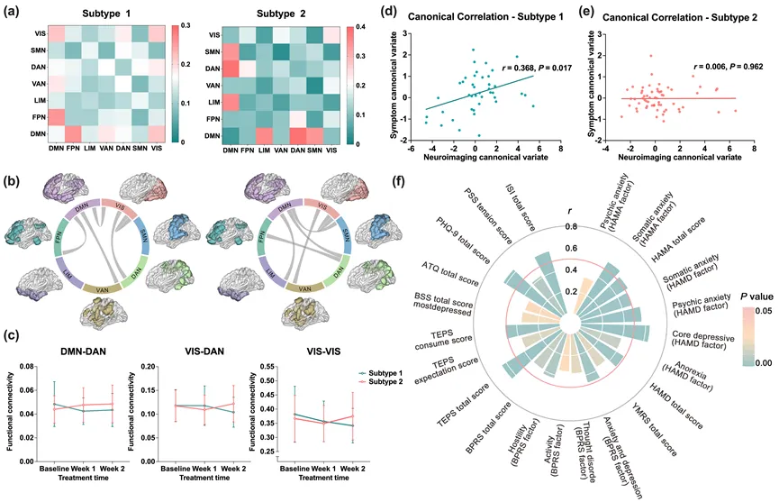 图2.两亚型网络间交互作用的轨迹差异,以及影像改变与症状变化之间的不同预测关系