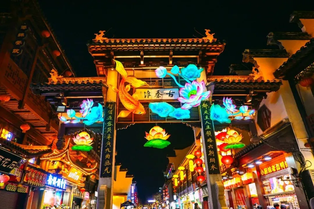花市灯如昼。翘角飞檐下是叫卖的商户和摩肩接踵的游客。这金陵的街巷真是与北国大有不同,商户的小厮站在门口争相展示自家商品,桂花酒醇香四溢,茶点精巧玲珑。我竟被熙攘人潮裹挟其中,欲凑近细看,却总为往来人影所隔,终是未能看得真切。