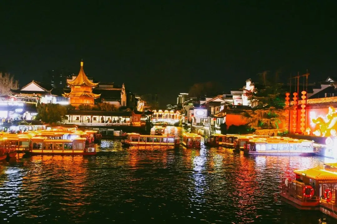 复行百余步,豁然开朗。秦淮河上石桥缀满花灯,流光溢彩。我随人流拾级而上,凭栏远眺:水面上游船往来,桨声轻摇,漾开层层涟漪;两岸屋舍鳞次栉比,皆被灯火晕染,如梦似幻,一派人间盛景。