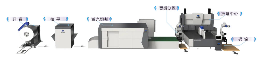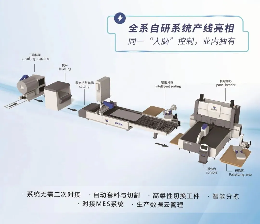 产线由同一系统控制,可单件、成套及批量生产钣金件,高度柔性无缝衔接,解锁钣金生产高效新模式。