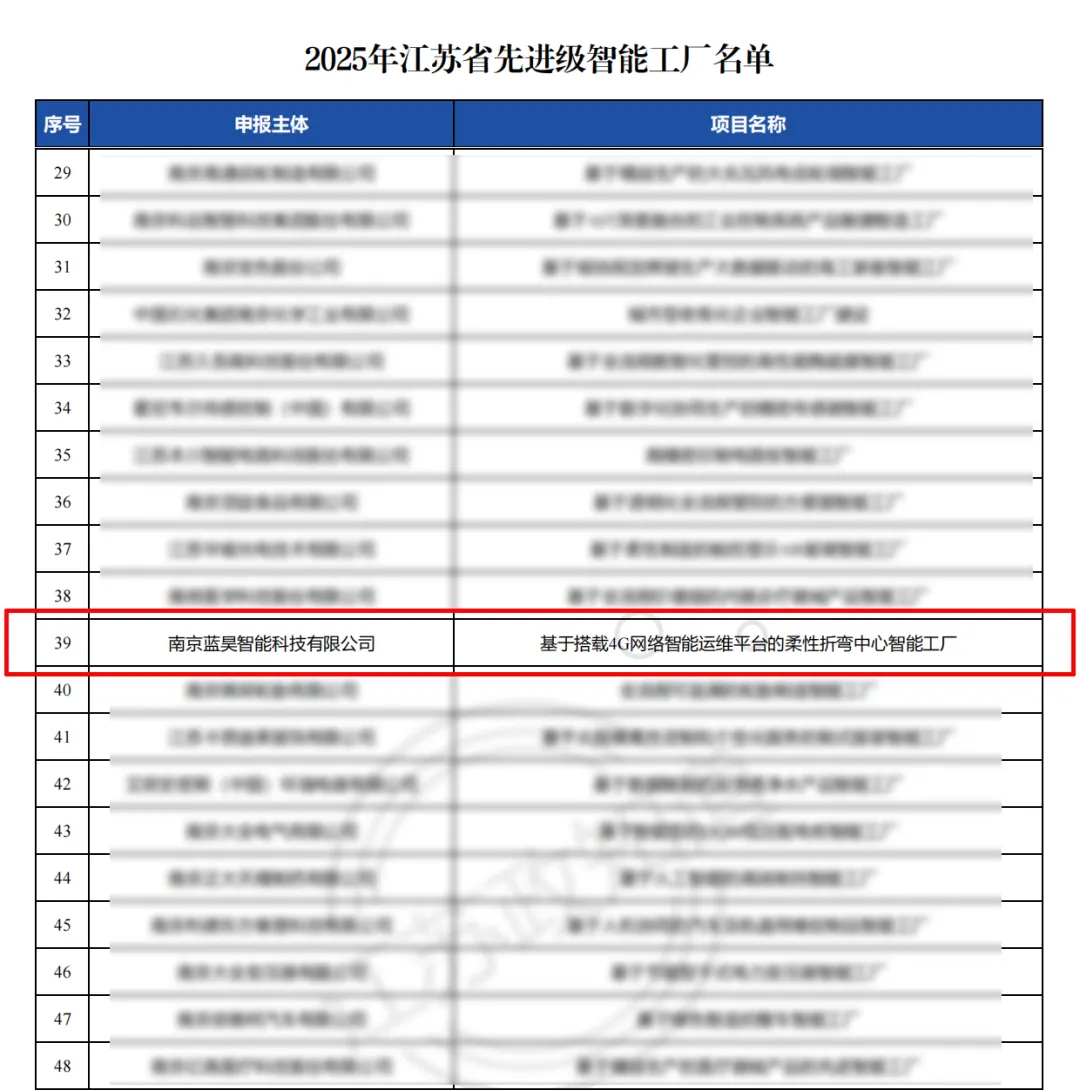 聚焦先进级智能智造,打造信息化云端管理。南京蓝昊凭借项目“ 基于搭载4G网络智能运维平台的柔性折弯中心智能工厂 ”成功入选2025江苏省先进级智能工厂。