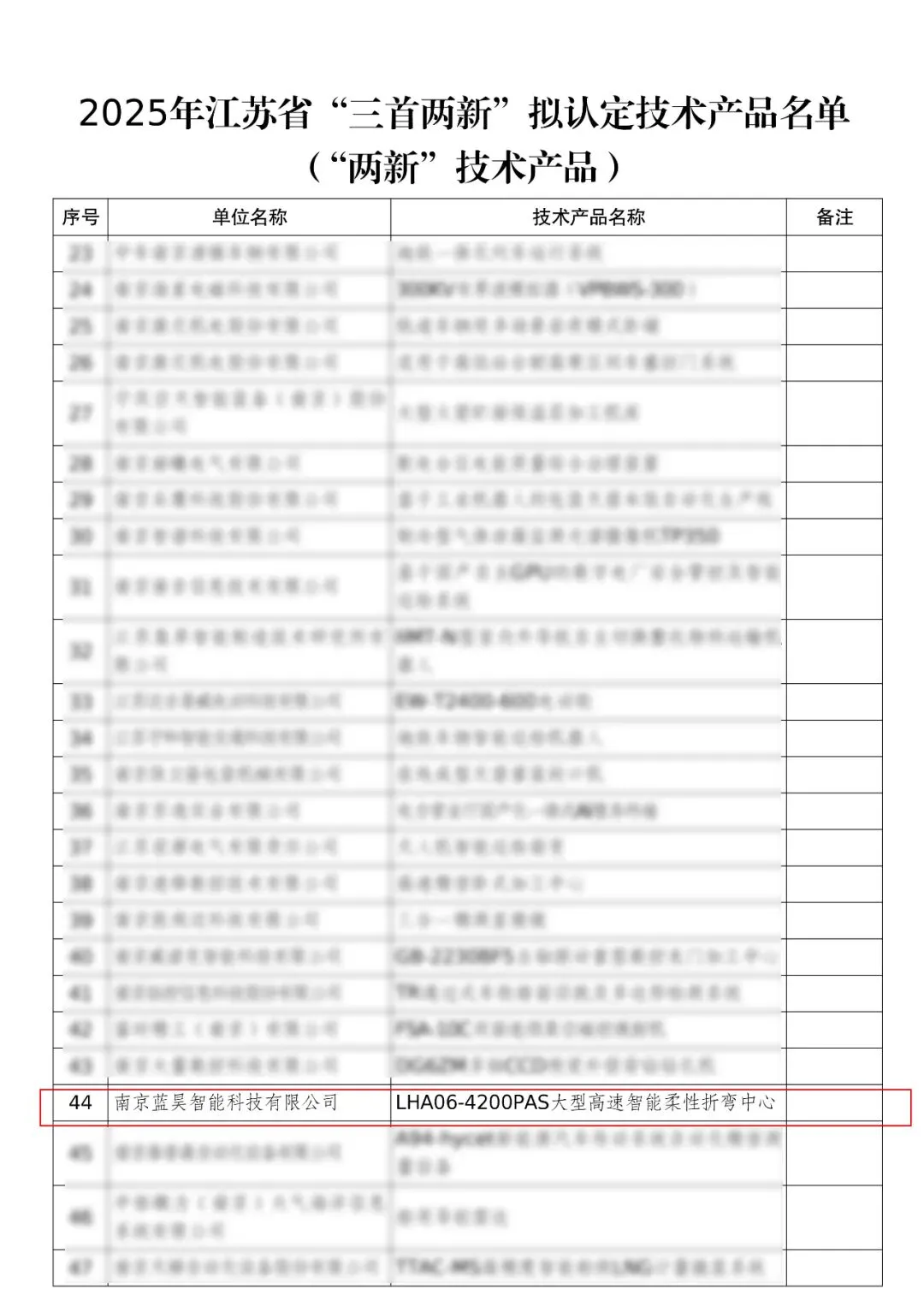 南京蓝昊自主研发的"LHA06-4200PAS大型高速智能柔性折弯中心"成功通过2025年度江苏省"两新"技术产品认定!这是对我司在高端智能制造装备领域的创新能力和行业价值的认可,标志着公司在核心技术、自主创新、行业贡献等方面实现了重大突破!