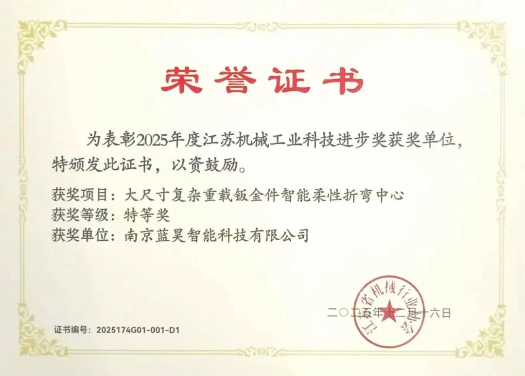 南京蓝昊重点科研项目——大尺寸复杂重载钣金件智能柔性折弯中心,荣获2025年度“江苏机械工业科学技术进步奖”特等奖。