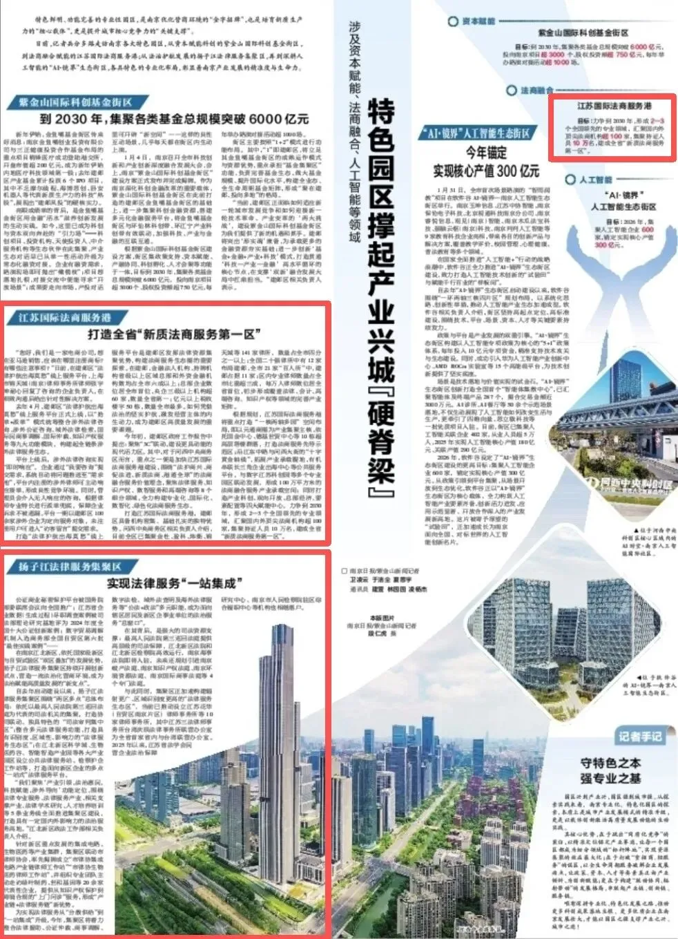 今年初,建邺区政府工作报告中提出:聚焦“3C”联动,建设更具动能的现代活力区。其中,对于河西中央商务区而言,重点之一便是加快江苏国际法商服务港建设,围绕“法护商兴、商促法进、新质法商、港通全球”的法商融合服务价值理念,聚焦法律服务、知识产权、数智服务和高端咨询等8个细分领域,全力构建专业化、国际化、数智化、绿色化法商服务生态。