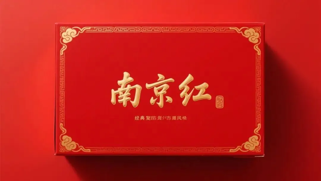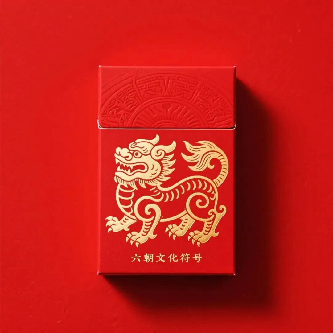 红南京的包装设计堪称中式卷烟美学的经典案例。主色调采用大红色底衬配金色字体,正面"南京"二字取自书法家武中奇的榜书,笔力遒劲、气势恢宏;背面的南京市徽"辟邪"图案(六朝石刻神兽造型)更是点睛之笔,将地域文化符号转化为视觉识别核心。