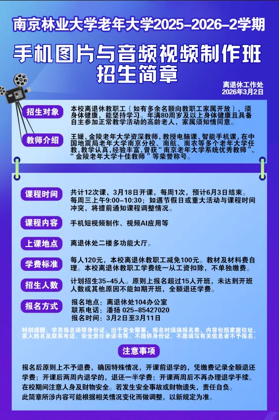 >南京林业大学老年大学2025-2026-2学期手机图片与音频视频制作班招生简章