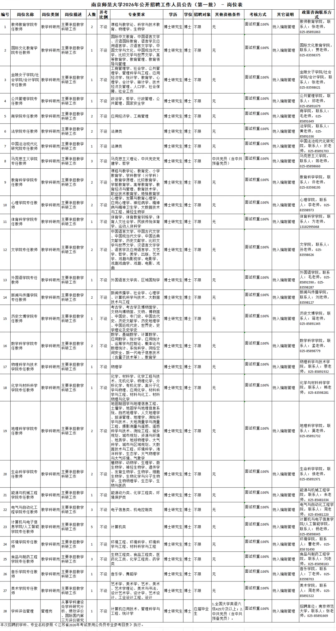 咨询电话:岗位1-27:025-85891809(招聘政策)、025-85891669(入职手续办理),联系人:薛老师、张老师;