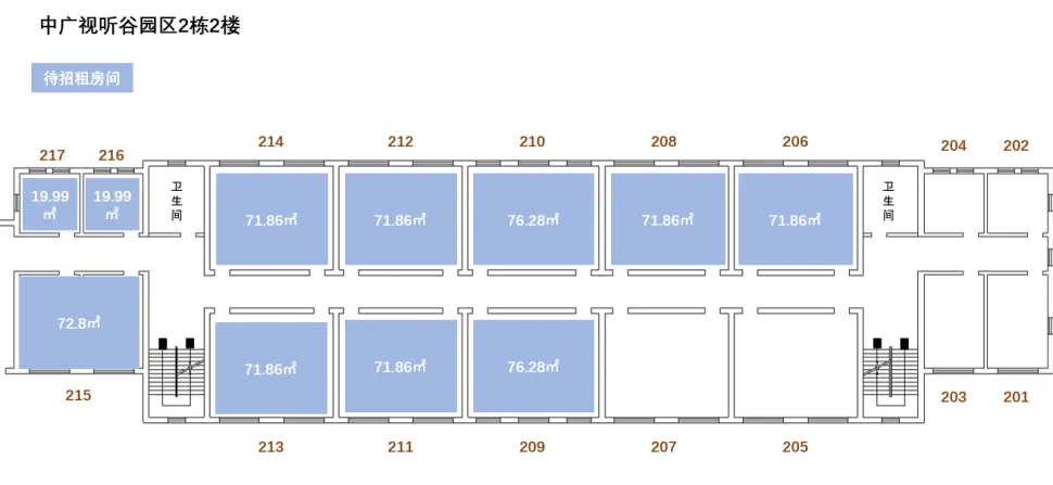 •2幢二层,十一个房间,可单间出租:20㎡—76㎡不等