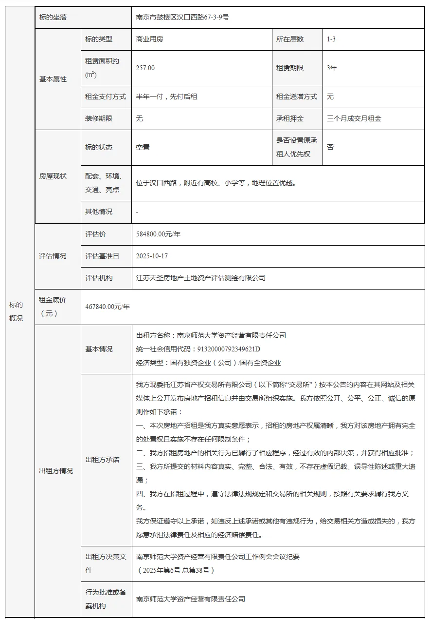 南京师范大学南京市鼓楼区汉口西路67-3-9号房屋公开招租(再次挂牌)