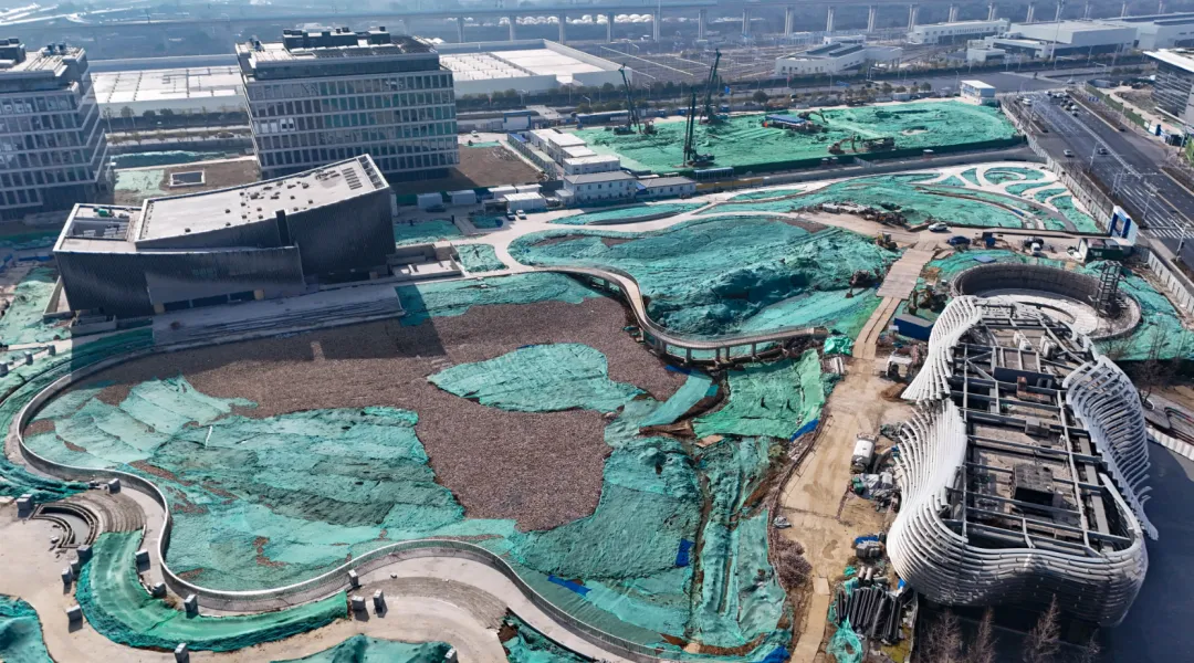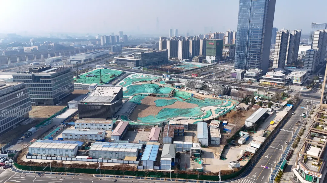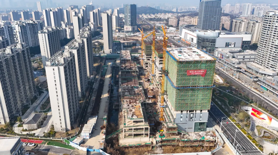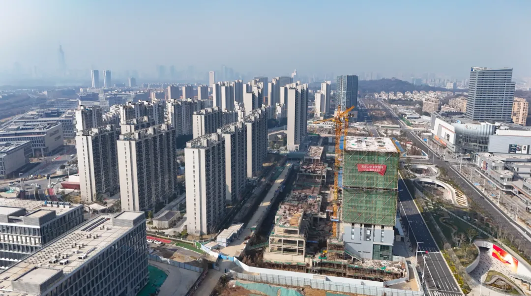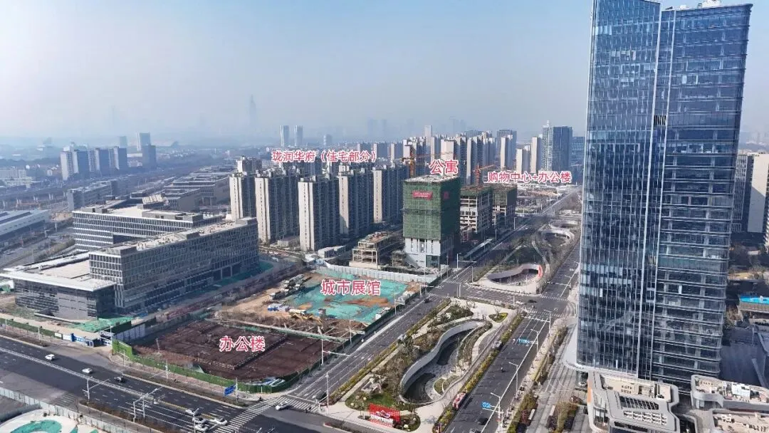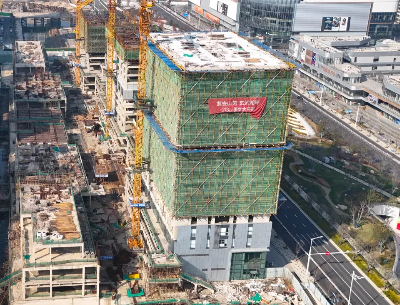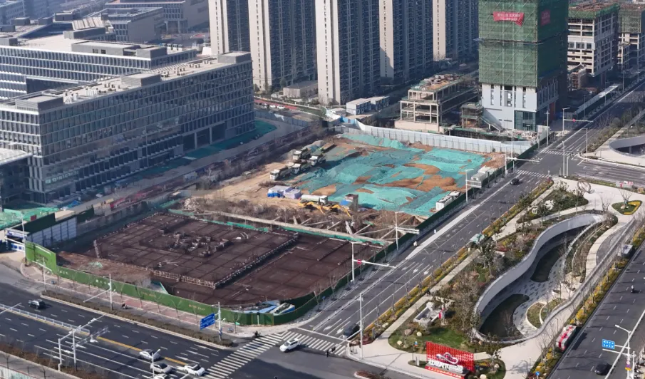 玄武宝龙城效果图从航拍图中可以发现,整个项目占地面积较大,体量非凡。目前项目的公寓楼部分建设进展较快,部分楼栋建筑高度已与住宅齐平,接近封顶。公寓部分是在2025年11月左右率先复工,这从侧面也可以看出来,项目是在不断推进中的。在公寓楼上还能看到“紫金山旁,玄武湖畔,213㎡大平层”的宣传标语。与之相对比,项目的购物中心以及甲级办公楼、城市展馆进展较慢。空中视角俯瞰,购物中心仍处于地下施工阶段,基坑中还有不少积水存在。宝龙购物中心工地与一路之隔的玄武招商花园城形成了鲜明对比,要知道玄武招商花园城地块拿地时间还比玄武宝龙城要晚1年。