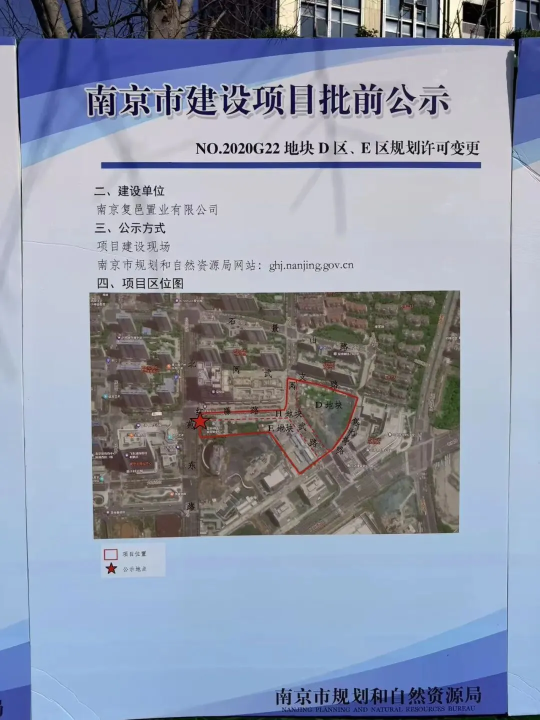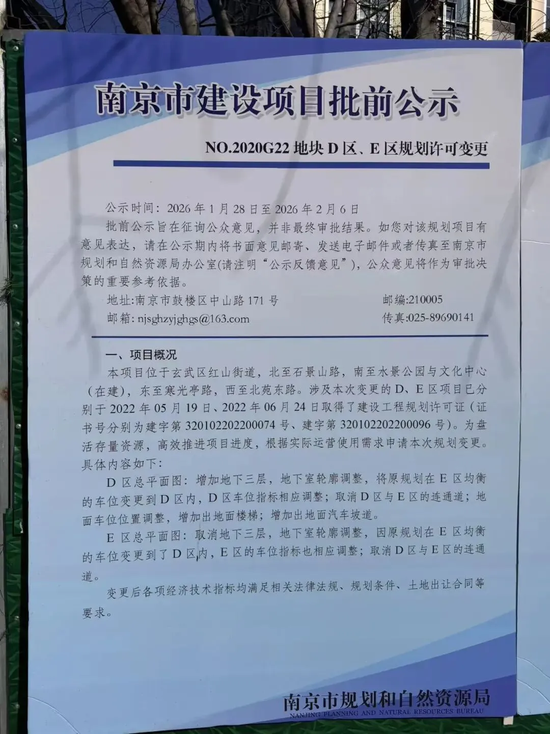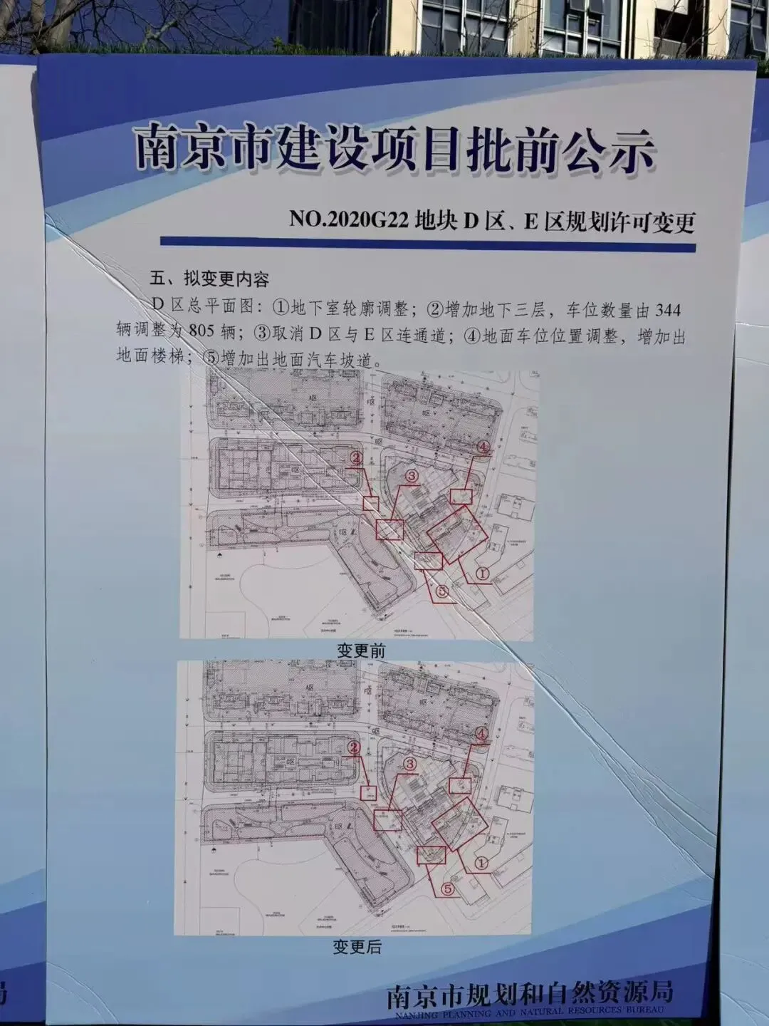 根据前期规划,项目商业包含建面约8万方的自持MALL和建面约2.8万方的主题商业街,商业体量近11万方,其中约8万㎡的MALL将由宝龙统一招商、规划、运营和服务。从目前进展来看,购物中心距离开业还有一定的时间需要等待。从航拍中可以发现,城市展馆地块已经全部平整完毕,地块之上还有不少施工车辆。办公楼地块基坑施工已经基本完成,不过该地块处于这一状态已有一段时间,并没有什么实质性的推动。整体来看,目前玄武宝龙城除了已经交付的住宅外,公寓、商场、办公、城市展馆均未建成,其中公寓部分进展稍快一些,并且已经复工。从官方回复来看,项目仍然在推进中,尤其是购物中心,代建单位正在洽谈中,确定会复工。值得注意的是,就在去年年底,江宁宝龙城正式开业,作为宝龙在南京主城打造的首个商业综合体,该项目的开业也为玄武宝龙城注入信心,让我们拭目以待。在玄武宝龙城斜对过就是复地明日之城,值得注意的是,在项目围挡外张贴出了D区、E区地块的规划许可变更。根据信息显示,D区总平面图:增加地下三层,地下室轮廓调整,将原规划在E区均衡的车位变更到D区内,D区车位指标相应调整;取消D区与E区的连通道;地面车位位置调整,增加出地面楼梯;增加出地面汽车坡道。E区总平面图:取消地下三层,地下室轮廓调整,因原规划在E区均衡的车位变更到了D区内,E区的车位指标也相应调整;取消D区与E区的连通道。