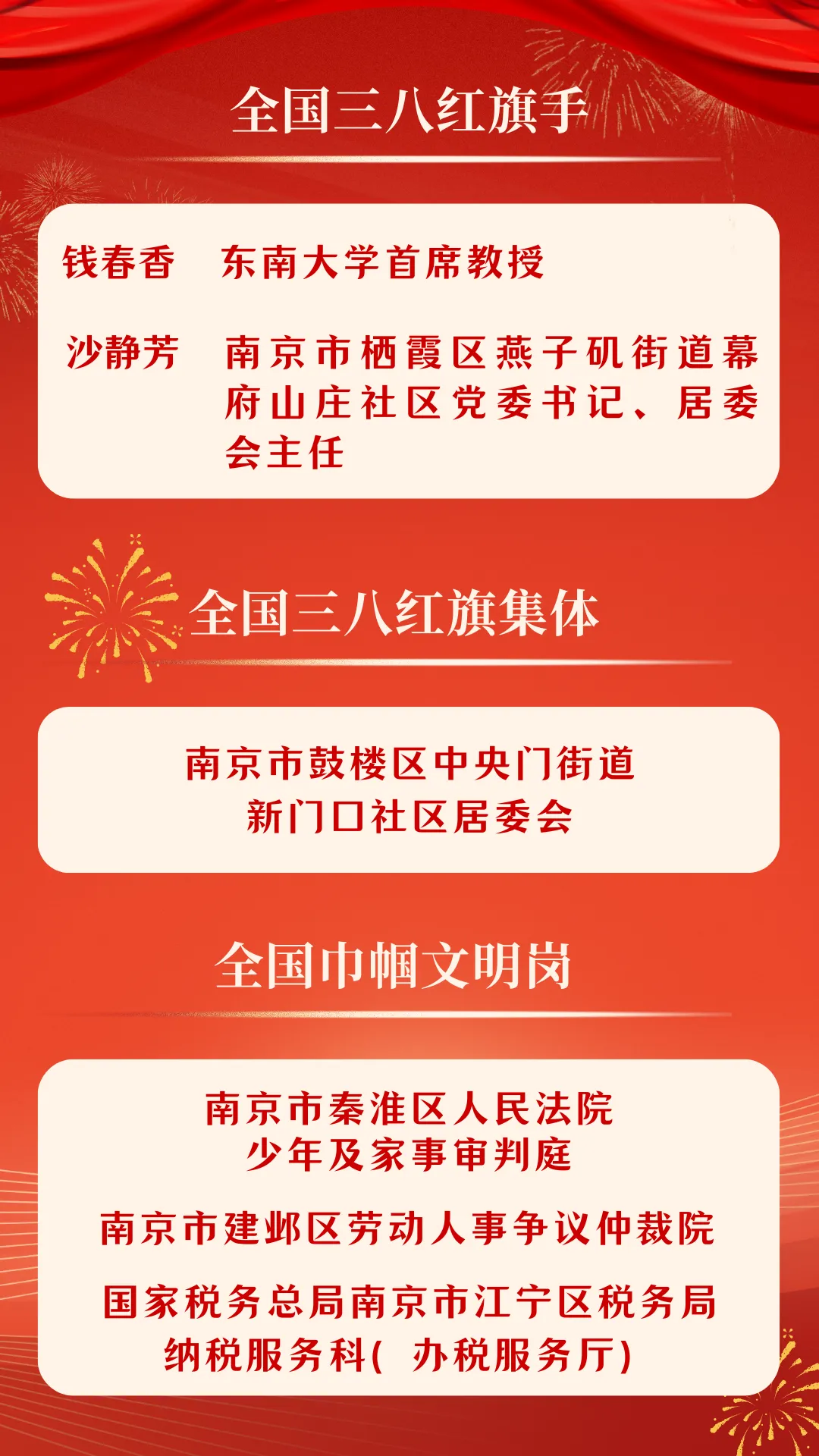 为表彰先进、树立榜样,充分发挥先进典型和模范人物示范作用,全国妇联决定,授予兰臻等9人全国三八红旗手标兵称号,授予阮祥燕等598人全国三八红旗手称号,授予中国人民抗日战争纪念馆社会教育部等400个单位全国三八红旗集体称号,授予首都医科大学附属北京同仁医院耳鼻咽喉头颈外科等600个单位全国巾帼文明岗称号。