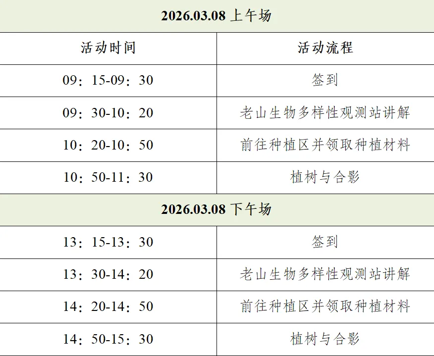 本次活动分上、下午两场开展,热烈欢迎个人、亲子家庭、企业团队及校园小队踊跃报名,一起为老山添新绿,守护生态之美,让绿色发展的理念在植绿护绿中落地生根。