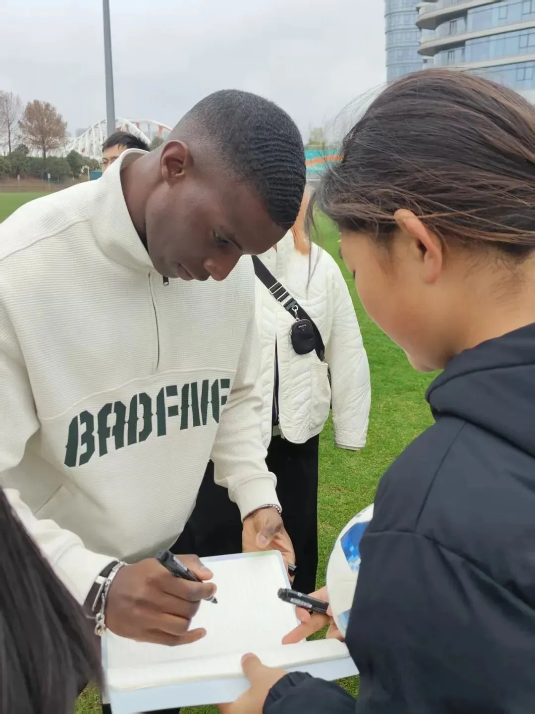 训练场上,小球员们难掩兴奋,纷纷向“偶像”围拢,“能给我签个名吗!”“我以后也想踢职业联赛!”吴曦和法比奥弯腰倾听每一个梦想,用签名和合影为孩子们种下热爱的种子。