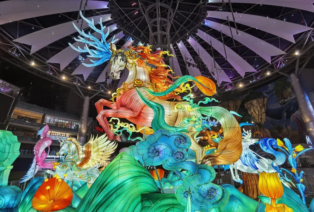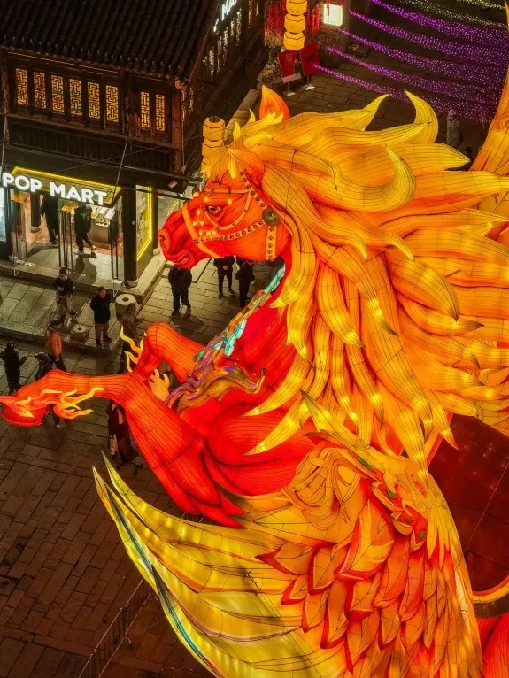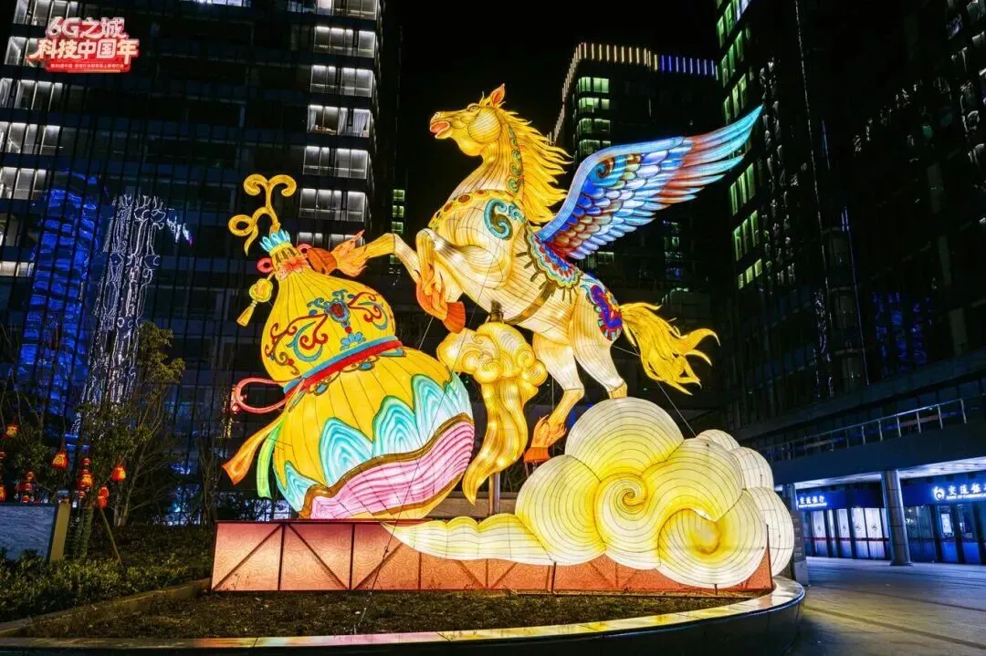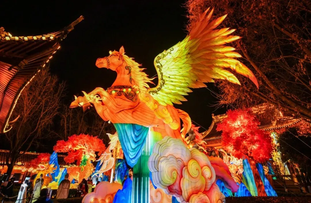 📍中山南路与升州路交界:灯组以“天马行空”为灵感,塑造一匹色彩绚丽、身形矫健的腾空天马为核心意象。