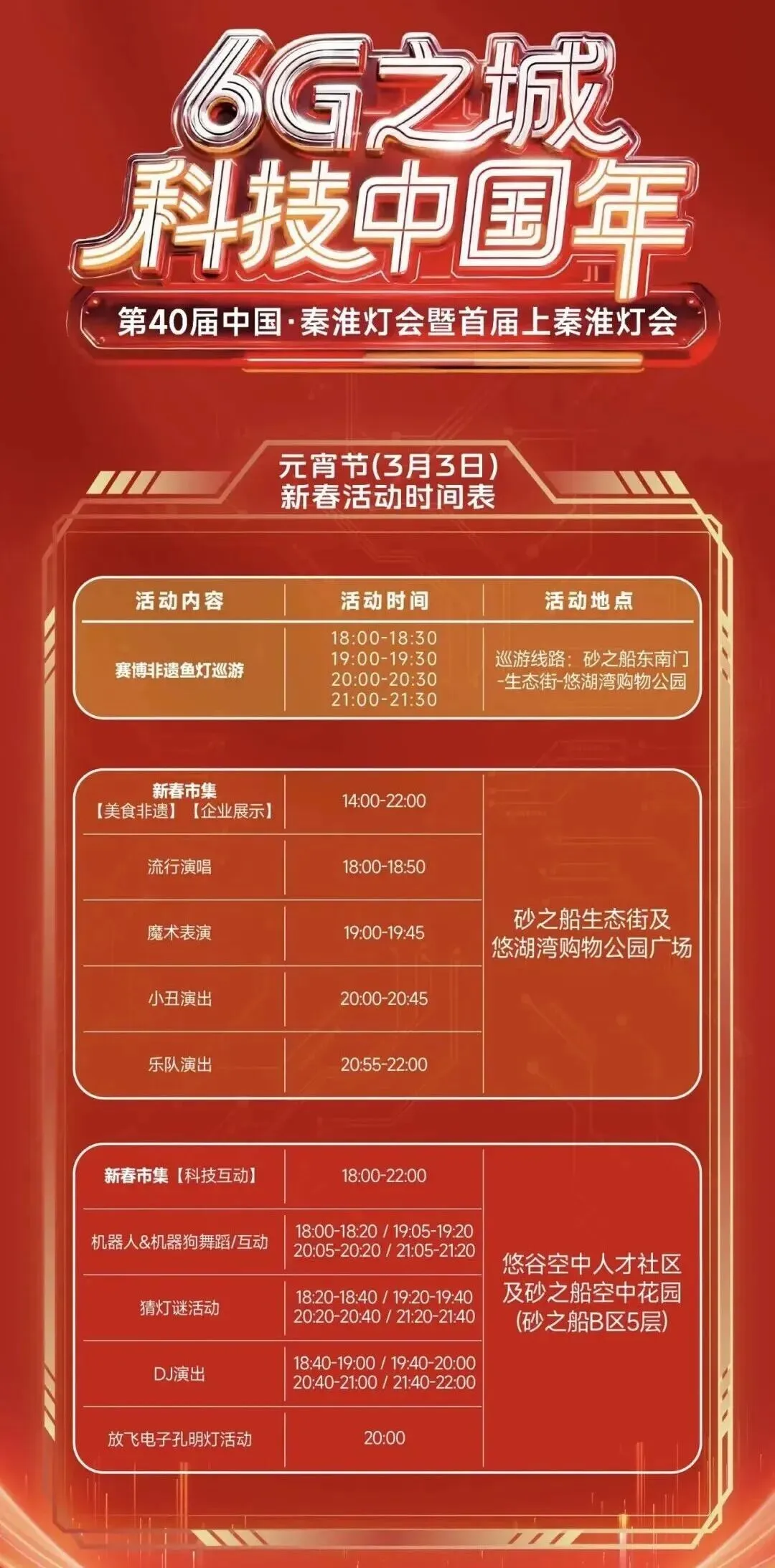以“传承经典·赋能新城”为主题,围绕“灯展、科技、市集、互动”四大维度展开,奉献一场深度融合秦淮传统文化与南部新城现代化风貌的灯彩盛会。