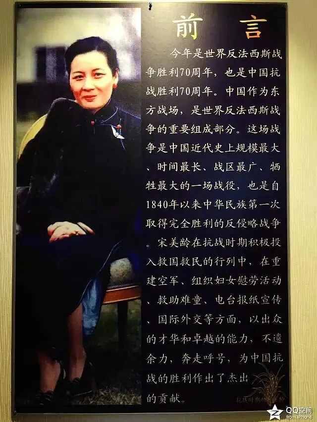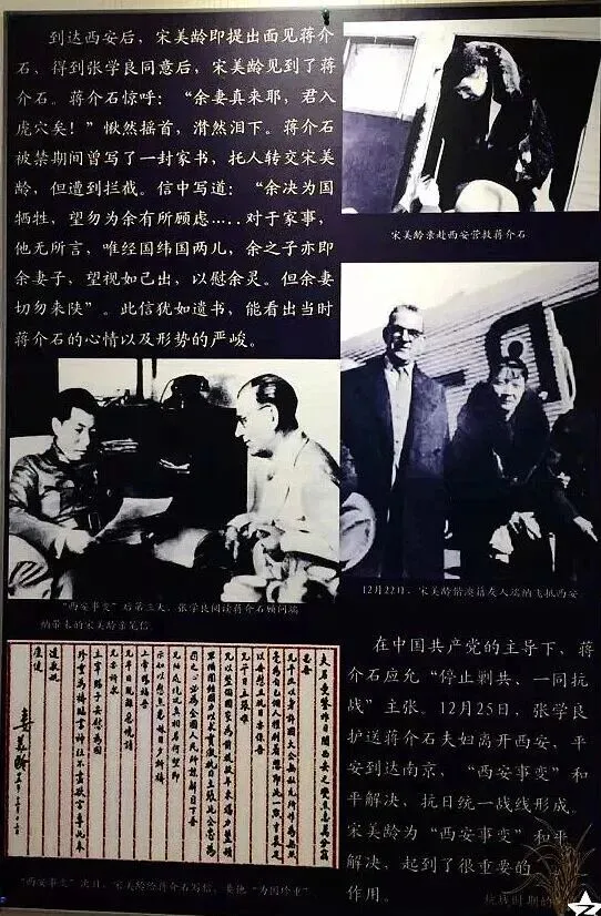 “西安事变“:抗日战争时期,国民党将军张学良、杨虎城兵谏蒋介石停止内战、一致对外的请求遭拒后,将蒋介石扣压在西安。当时国民党内部对此意见产生严重分歧。宋美龄以大局为重,力主和谈,避免事态恶化再生战争祸及百姓,并亲赴西安与各方代表谈判。为抗日战争统一战线的形成、和平解决”西安事变“起到了很重要的作用。