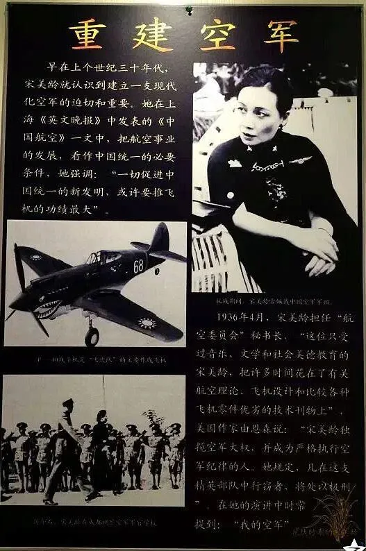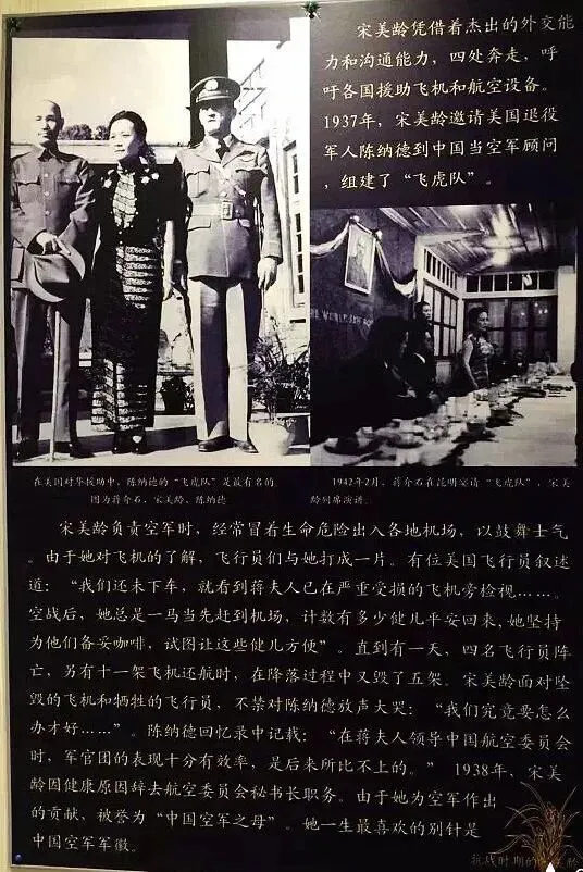 赫赫有名的”飞虎队“是美国军官陈纳德应宋美龄邀请来到中国,作为空军顾问组建的,在抗日战争中屡获奇绩。由于她为空军作出的贡献,被誉为 ”中国空军之母“。