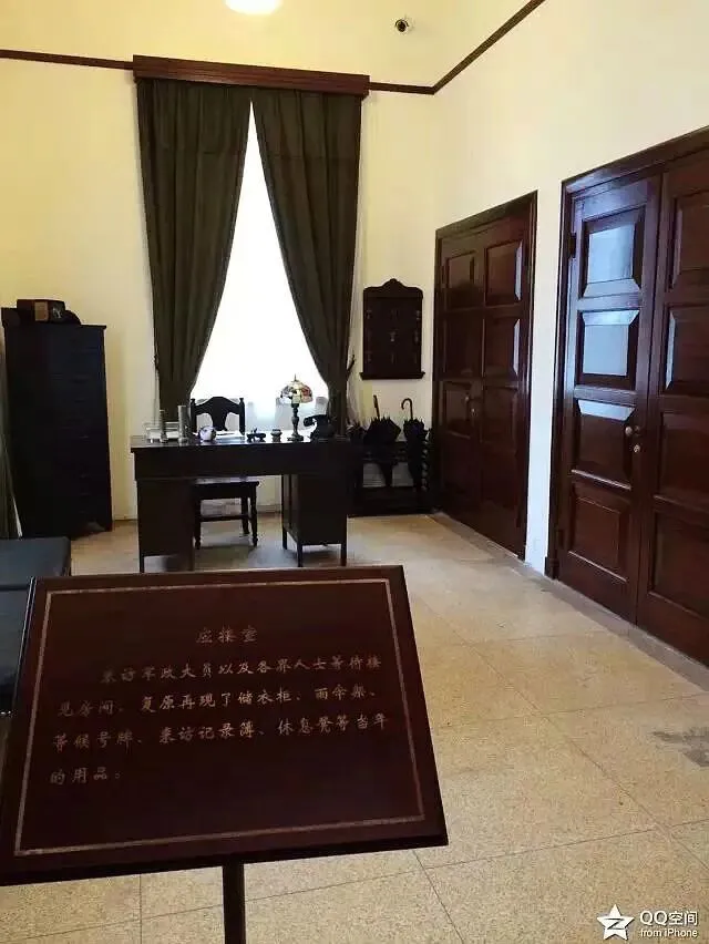 应接室。来访的军政大员以及各界人士等待接见的房间。复原再现了储衣柜、雨伞架、等候号牌、来访记录簿、休息凳等当年的用品。位于一楼。