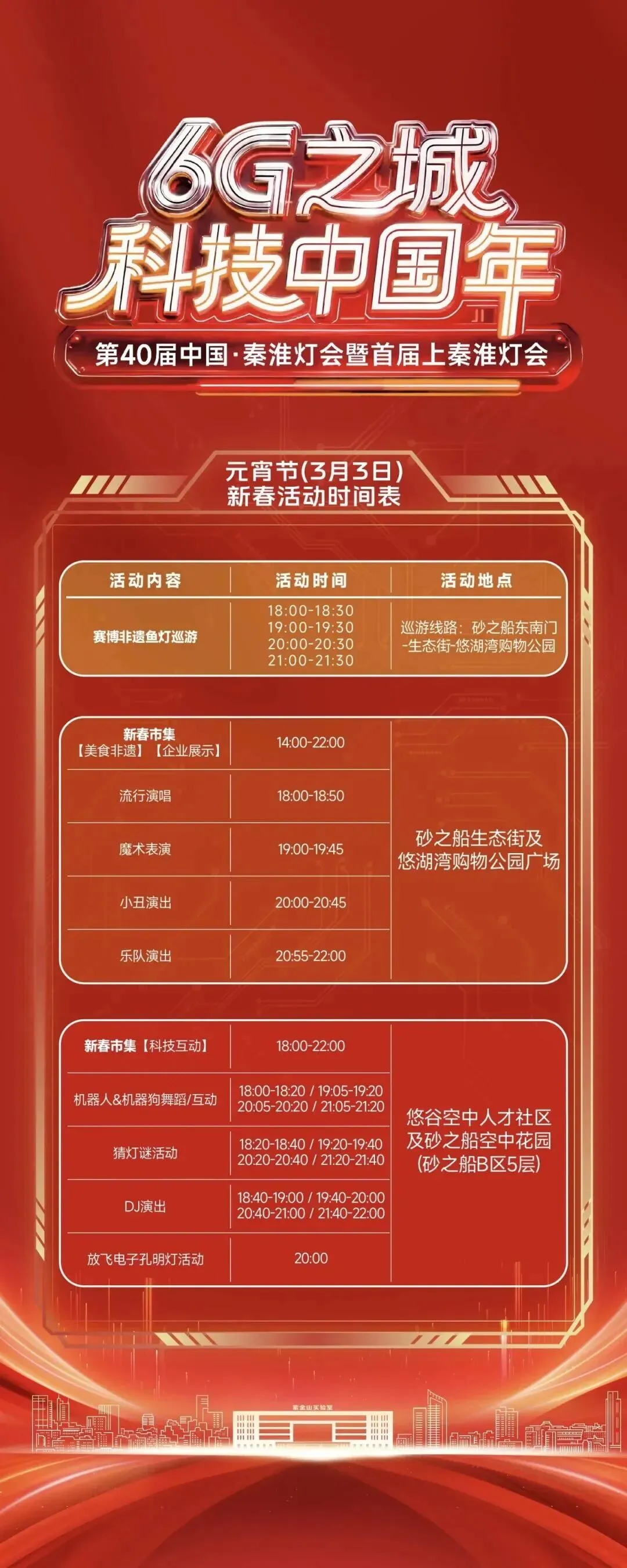 江宁最大裸眼3D大屏上演全息光影秀;新春市集汇聚非遗、科技、美食,逛吃间尽享元宵烟火气。鱼灯巡游、赛博巡游持续加持,传统文化与赛博文化碰撞融合,在“6G之城”织造幸福。