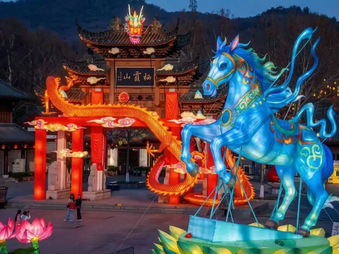 栖霞山首届新春灯会正在进行中。夜幕降临后,全山域花灯点亮,营造璀璨的光影奇境。