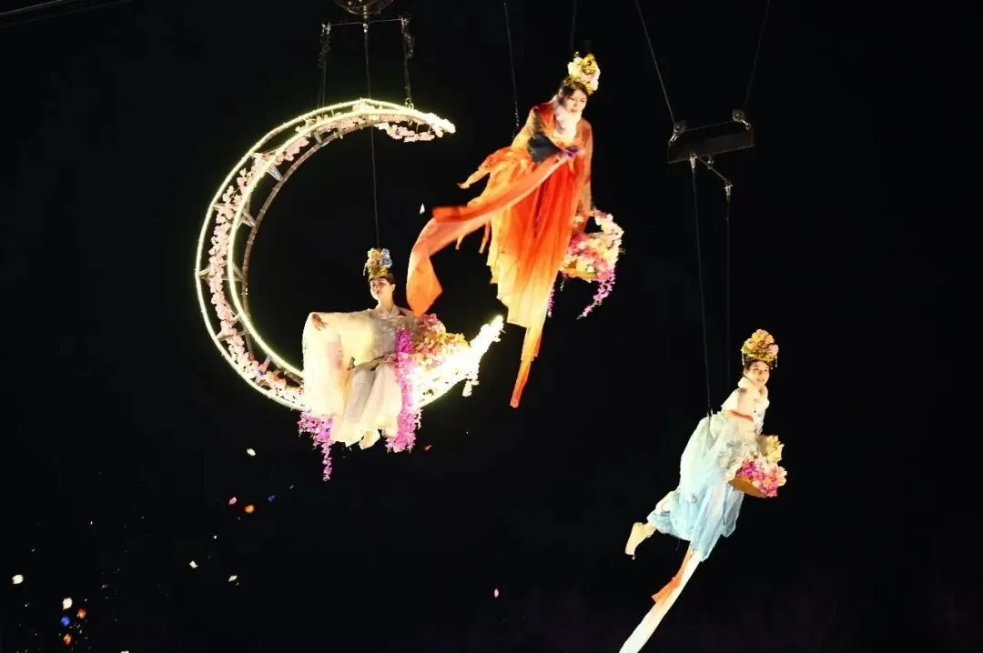 战旗舞飒爽开场,双狮跃动、古典舞翩跹,明镜湖上空天女散花,花瓣纷飞间仙气拉满,大牌坊前腾龙贺岁腾云驾雾的身姿藏着马年最旺的福气。