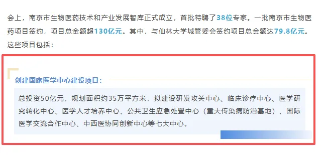 省人民医院国家医学中心规模有多大?据新闻介绍,创建国家医学中心建设项目总投资50亿元,规划面积约35万平方米,拟建设研发攻关中心、临床诊疗中心、医学研究转化中心、医学人才培养中心、公共卫生应急处置中心(重大传染病防治基地)、国际医学交流合作中心、中西医协同创新中心等七大中心。△图源南京仙林