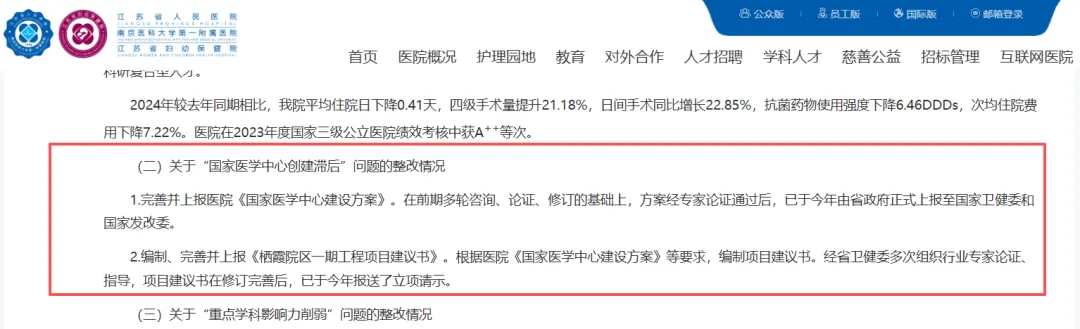 2024年5月,省人民医院国家医学中心项目首次进入公众视野。在当时举办的长三角生物医院创新与产业发展大会上,有网友曝光了现场签约图片:江苏省人民医院与南京市栖霞区人民政府、仙林大学城管委会签约创建国家医学中心建设项目。